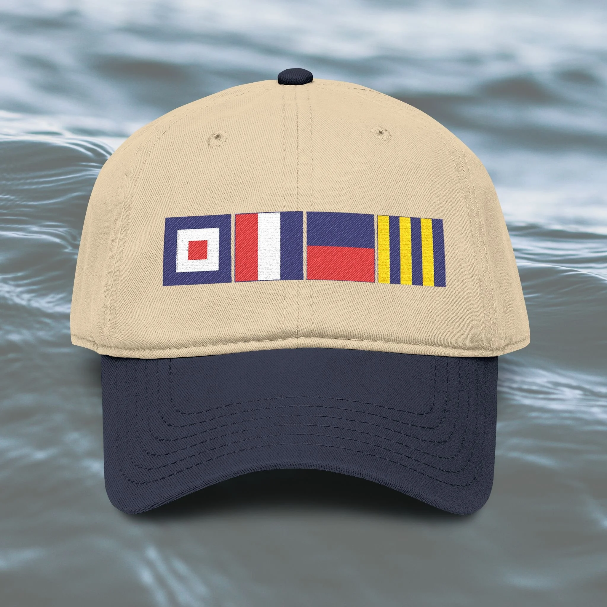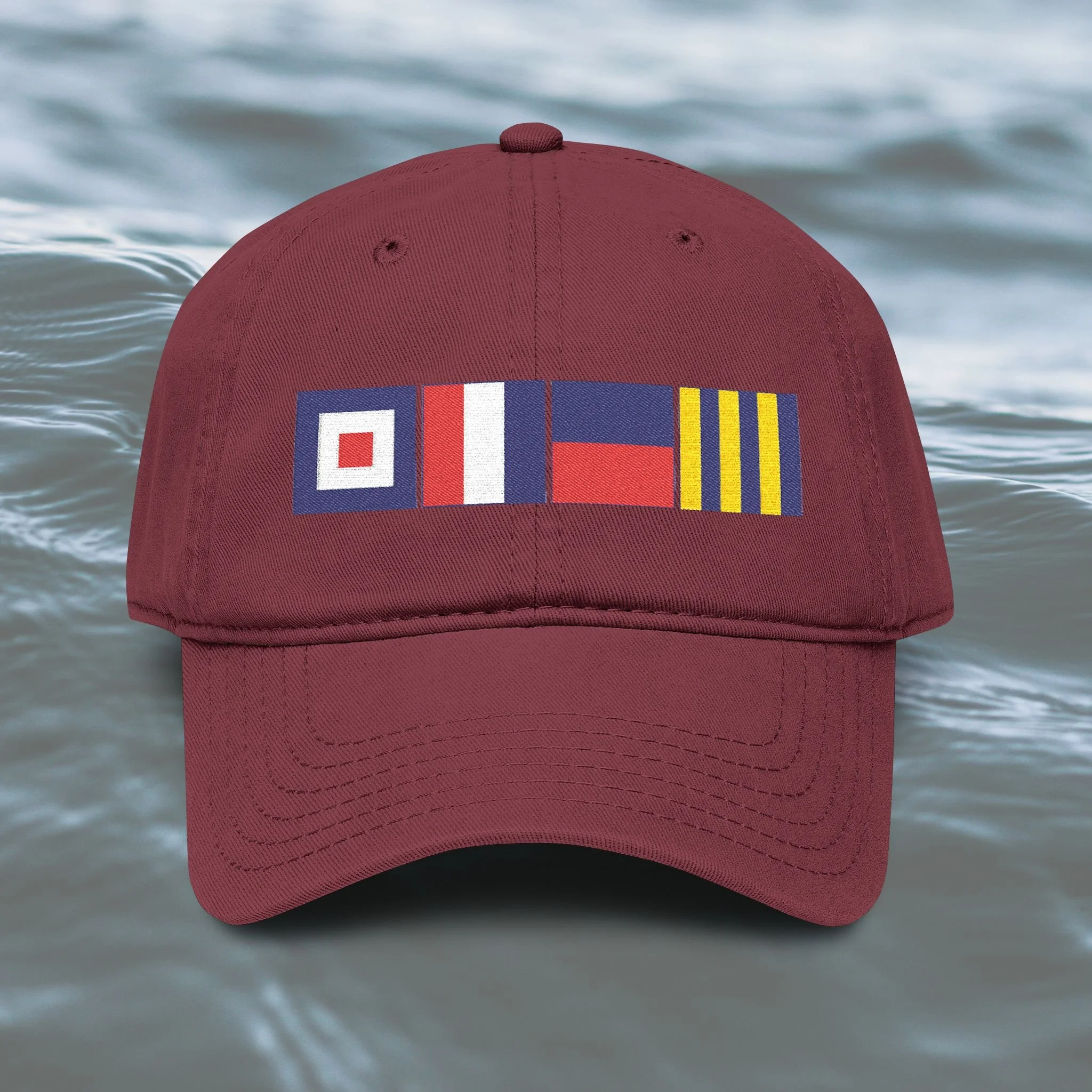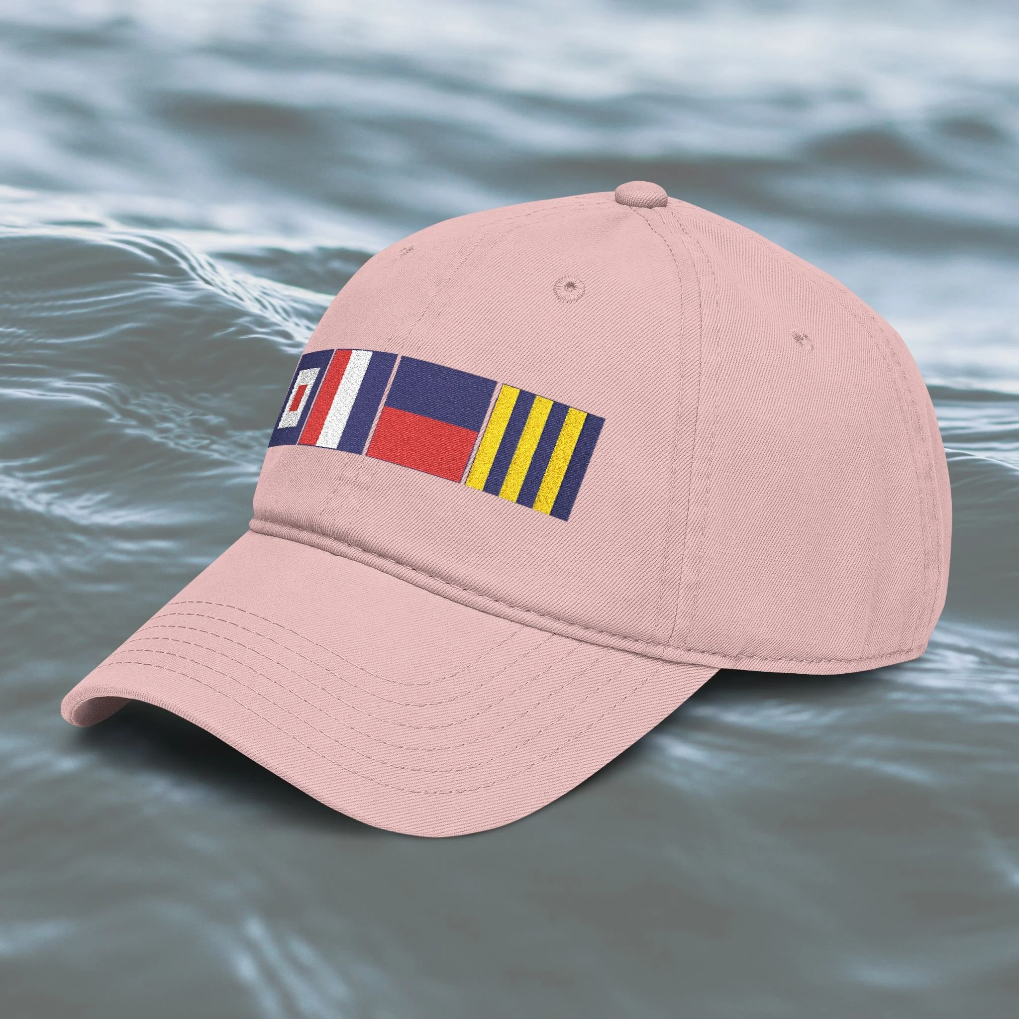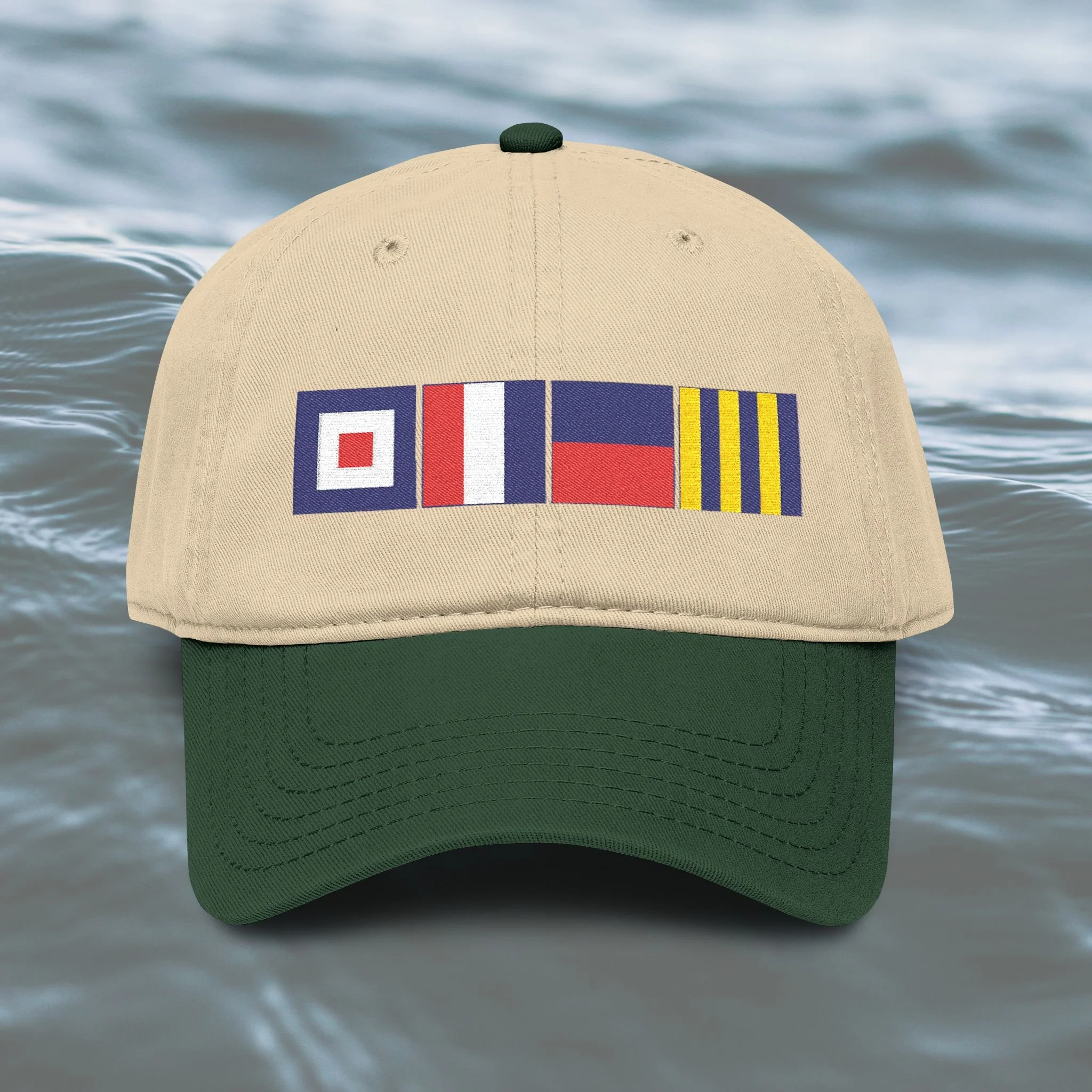 This washed baseball cap brings a quietly nautical vibe to everyday wear. Soft, broken-in 100% cotton forms a low-profile, unstructured crown that settles naturally on your head. On the front, a stitched row of our call sign. An antique-brass metal snap buckle at the back gives a vintage touch and easy adjustability. Wear it on breezy mornings by the harbor, late-afternoon walks along the pier, or while fixing lines on the boat.